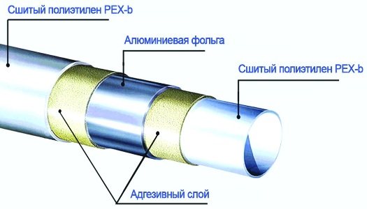 L'aluminium donne de la résistance aux tuyaux et, grâce au propylène, ces appareils de plomberie peuvent être pliés en biais sans trop d'effort. La bande d'aluminium d'épaisseur minimale est constituée de deux pièces semi-circulaires. Ils sont connectés de bout en bout ou se chevauchent. Pour une adhérence fiable, le soudage est utilisé à l'aide d'ultrasons. Après une telle procédure, des couches de polypropylène avec un adhésif sont appliquées de l'extérieur et de l'intérieur.
