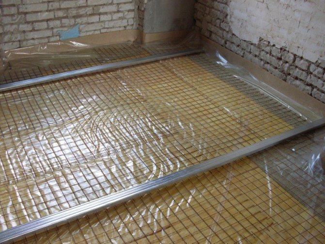 - L'isolation du sol est prête : il est temps de commencer la chape. Au-dessus de la couche d'étanchéité, une grille est posée et une chape est coulée.