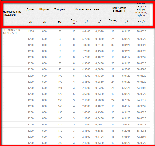 Longueur - 1000, 1200 mm Largeur - 500, 600 mm Épaisseur - 40-200 mm, avec un pas de 10 mm