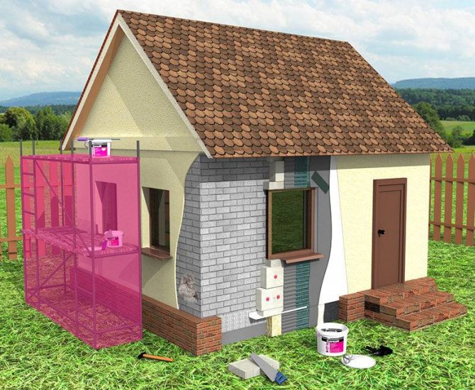 Si les conditions météorologiques ne correspondent pas à celles spécifiées par le fabricant, des échafaudages sont construits autour de la maison et entièrement recouverts d'un film qui protège du vent et des pluies légères.