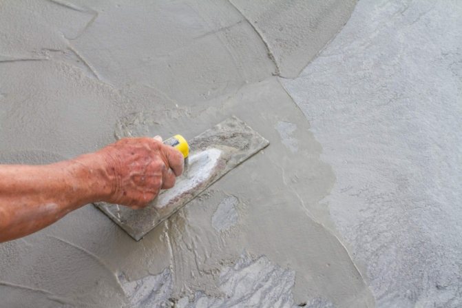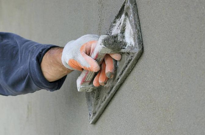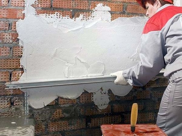 - Les murs sont alignés avec le mélange de plâtre de base. Par temps chaud, les surfaces en béton ou en brique sont humidifiées.