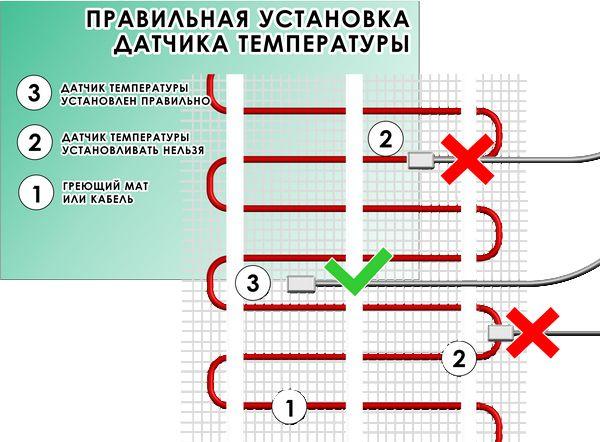 Étape 10. Si tout va bien et que le système de chauffage par le sol fonctionne, alors une lumière sur le thermostat, ou plutôt, sur son panneau, s'allumera. L'opérabilité de l'ensemble du système sera également attestée par le chauffage de la surface du sol. Le diagramme montre l'emplacement d'installation du capteur de température.