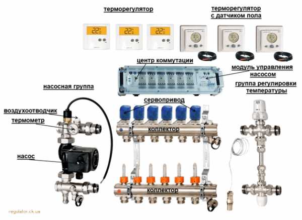 Un ensemble de chauffage par le sol pour chauffer des pièces d'une superficie de 60 à 80 m2 avec un mélangeur avec réglage manuel de la température du fluide caloporteur en fonction du mitigeur et de la vanne de séparation MIX 03. La température de fonctionnement du fluide caloporteur est ajusté automatiquement par le servo de la vanne en fonction de la température du fluide caloporteur réglée sur l'échelle du thermostat appliqué.