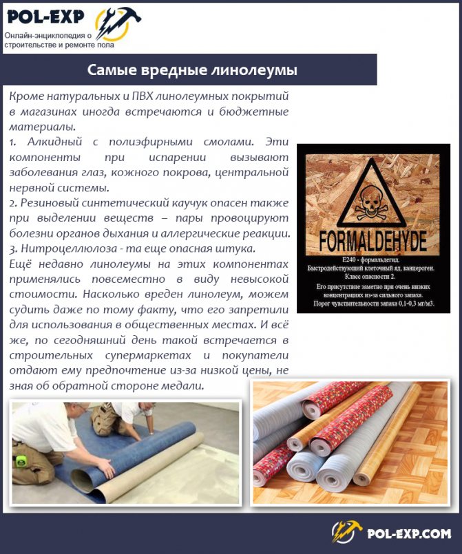 En cas de surchauffe prolongée, le linoléum peut émettre des formaldéhydes - des substances nocives qui affectent négativement le corps humain. Par conséquent, la surchauffe du sol ne doit pas être autorisée lors de l'utilisation du linoléum comme revêtement de sol.