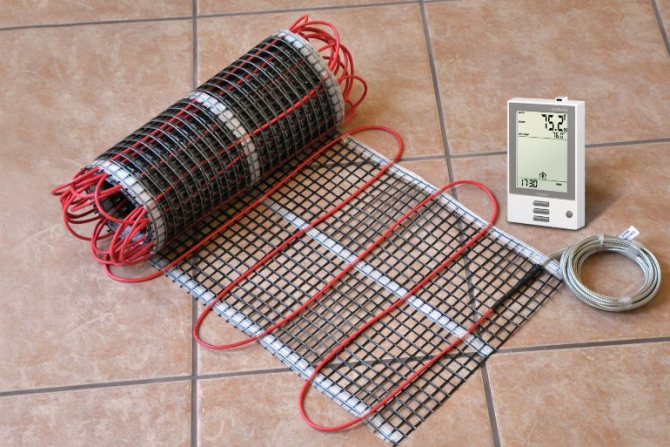 En plus du câble lui-même avec un fil de connexion froid, le kit d'installation comprend un capteur de température avec un thermostat. Un morceau d'ondulation électrique est nécessaire pour le capteur de température.Un ruban de montage spécial pour le câble chauffant est également nécessaire, si l'installation est effectuée dans les rainures, cela n'est pas nécessaire. Une boîte de prise est nécessaire sous le thermostat.