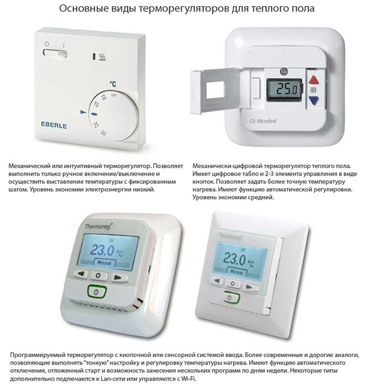 Pour éviter la surchauffe du système, lors de l'installation d'un sol chaud, un thermostat - un petit appareil qui régule la température. Il existe trois principaux types de thermostats: électroniques, mécaniques et programmables. Tous diffèrent entre eux non seulement par leur nom et leur prix, mais également par leurs caractéristiques techniques. Par conséquent, lors du choix d'un produit, il est impératif de consulter un spécialiste.
