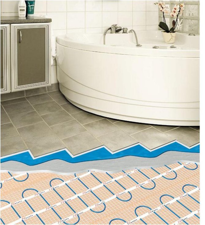 Film thermique infrarouge et stratifié dessus.Si des carreaux sont prévus, un treillis métallique (maçonnerie) est posé sur cette mousse, un câble chauffant est coulé dessus et une chape de 3 à 5 cm est coulée. autre tuile. Ou, d'abord, un treillis métallique, une chape, puis un câble fin, qui est situé dans une couche de colle à carrelage.