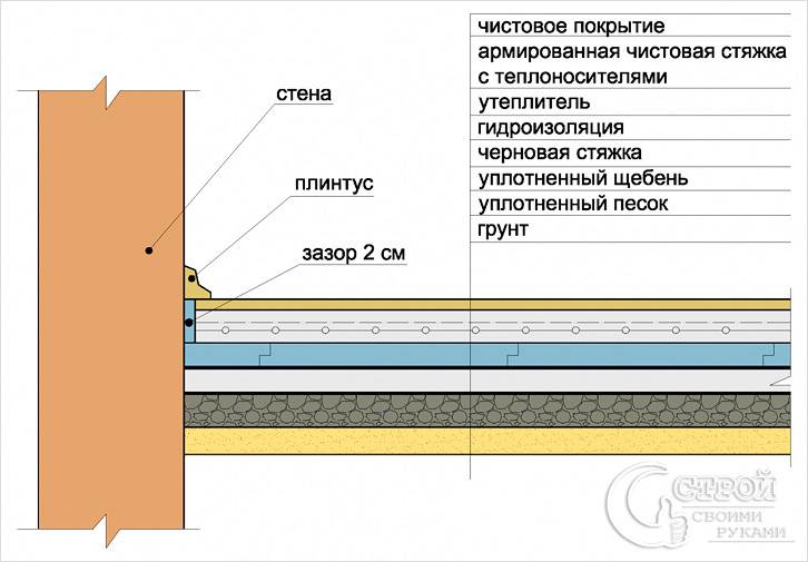 La structure du sol lorsqu'elle est appliquée est la suivante: imperméabilisation, puis caisse en bois, entre laquelle sont installées des feuilles de coton, de panneaux de particules ou de fibres de bois pour niveler la surface et le revêtement de sol de finition (stratifié, moquette, linoléum ou autre).