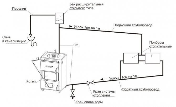 - Depuis le point haut, le remplissage retourne à la chaudière avec une légère pente constante nécessaire au déplacement gravitaire de l'eau de refroidissement. En cours de route, le liquide de refroidissement dégage de la chaleur vers des radiateurs ou d'autres appareils de chauffage.