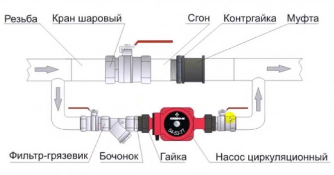 Sur la photo, au lieu d'une vanne, le remplissage éclate avec un clapet anti-retour à bille. Une telle mise en œuvre est capable de passer en circulation forcée lorsque la pompe démarre automatiquement, mais est moins sûre en cas de panne.