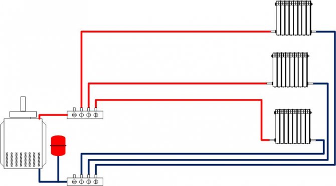 Les deux types de pose de tuyaux de chauffage décrits ci-dessus sont représentatifs de la méthode du périmètre. Mais il existe une alternative - le rayon. Avec une telle pose, les tuyaux sont fournis séparément à chaque radiateur: l'un, à travers lequel le liquide de refroidissement pénètre dans le radiateur, l'autre est inversé. Un tel système vous permet d'ajuster un régime de température confortable dans chacun des locaux de la maison. De plus, si l'un des radiateurs ou des tuyaux tombe en panne, il n'est pas nécessaire d'éteindre tout le chauffage, il suffit de le faire uniquement dans la zone souhaitée.