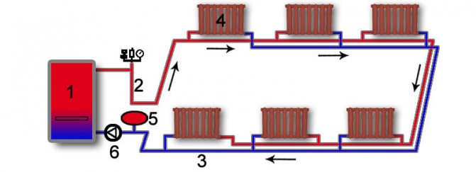 Les systèmes de chauffage d'eau sans issue sont des systèmes à deux tuyaux dans lesquels les directions de l'eau dans les flux d'alimentation et de retour sont opposées. Le liquide de refroidissement atteint les radiateurs éloignés et revient. Mais s'il continue à se déplacer vers la chaudière ou l'unité de chauffage, en gardant la même direction, notre schéma devient passager.