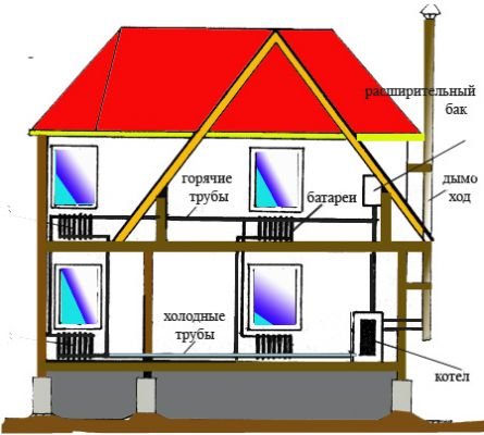 Ensuite, il va de celui-ci à la canalisation chaude, qui est située dans le grenier ou sous le plafond des étages supérieurs de la maison, entre dans la colonne montante chaude et est ensuite alimenté par des batteries de chauffage ou d'autres appareils de chauffage.