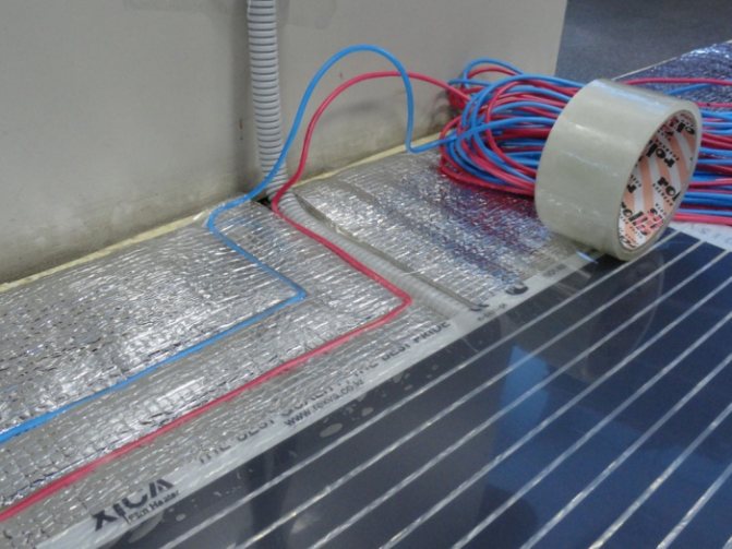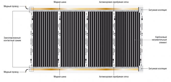 Permet l'installation sous stratifié, parquet et moquette. Ici, la structure est déjà complétée par une grille de séparation en argent entre l'émetteur et le rail d'alimentation. Et le système lui-même peut se vanter d'un transfert de chaleur accru, ce qui lui permet d'être utilisé comme principale source de chauffage.