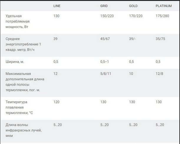 Le plancher de film chaud de la série "dorée" Caleo est capable d'un travail plus économique. Cela est dû à la fonction d'autorégulation, qui réduit la consommation de courant avec une augmentation de la température de chauffage. La puissance de l'or est assez correcte - 170 W, et la consommation d'énergie lorsque le relais thermique est allumé ne dépasse pas 39 W. Cela indique une efficacité vraiment élevée du système. Cependant, le choix des tailles est tout aussi médiocre.