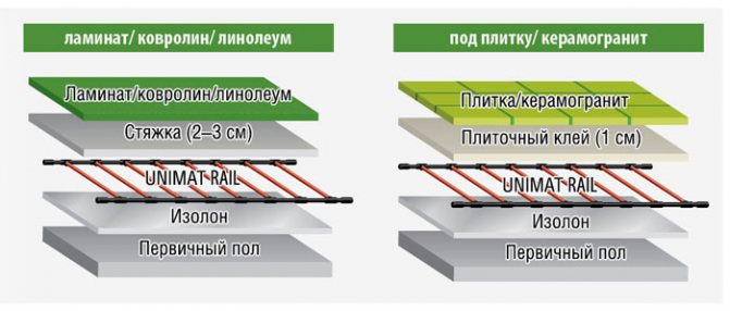 - Le chauffage par le sol Unimat a une régulation intelligente du travail - dans les zones de chauffage insuffisant, la tension d'alimentation augmente automatiquement et avec un excès de chaleur, elle diminue.