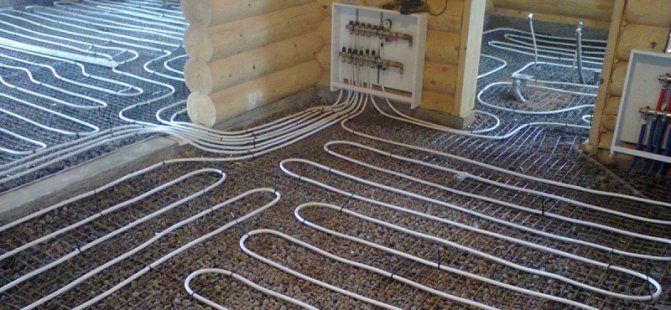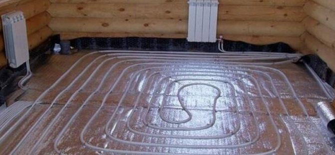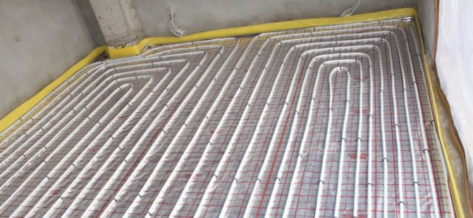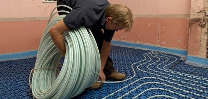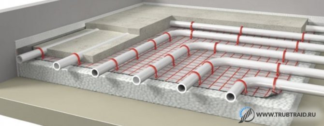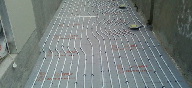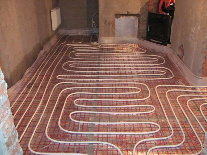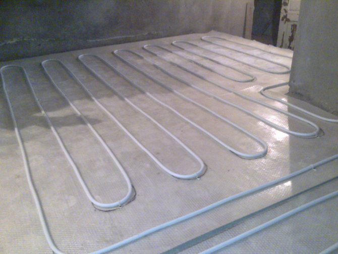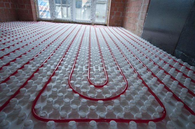 - Couler le chauffage par le sol avec des tuyaux PEX avec une chape en béton jusqu'à 8 cm de profondeur.