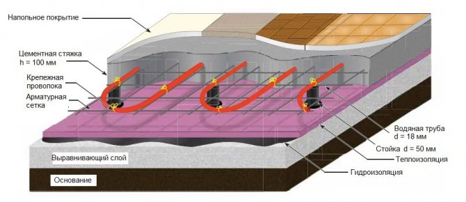Pour le chauffage par le sol à base d'eau, une surface plane de la base rugueuse est nécessaire. Il est recommandé de réaliser une chape, un sol autonivelant ou d'utiliser un mélange autolissant. La plomberie est posée sur une surface sèche. Il est recommandé d'utiliser des matériaux isolants pour que toute la chaleur du circuit d'eau soit dirigée vers le sol.