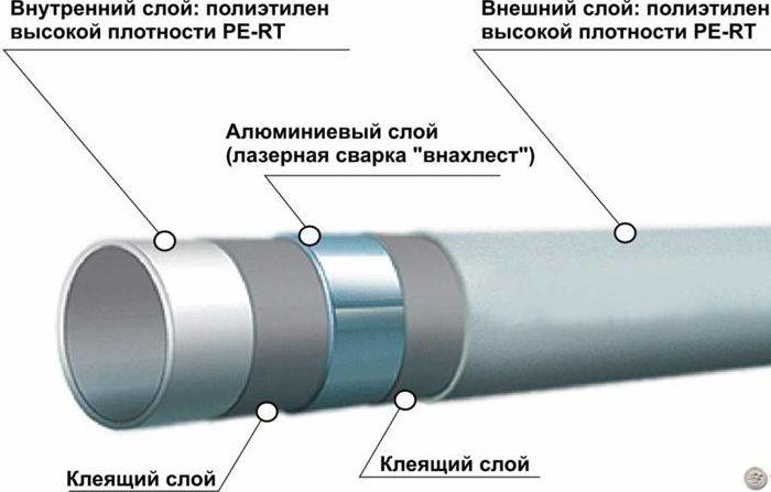 Le PEX-a est une construction multicouche avec un insert en aluminium entre les couches, ce qui aide à maintenir la forme du produit. Une colle spéciale est utilisée pour relier les couches; elle ne change pas ses propriétés sous l'influence de la température.