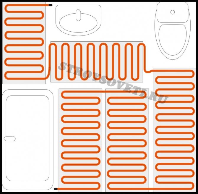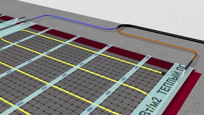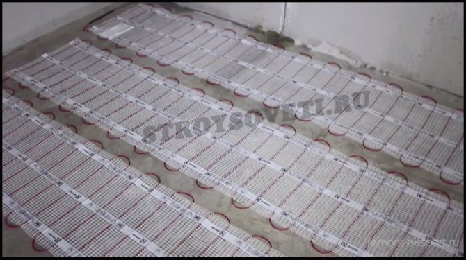 Une connexion parallèle est utilisée pour commuter des sections individuelles. Les passe-câbles comprennent un câble chauffant unipolaire avec un serpent. La base ici est un film avec un treillis de renfort. L'installation d'un sol chaud à partir de nattes est beaucoup plus facile et plus rapide que les systèmes de câbles.
