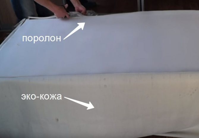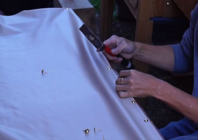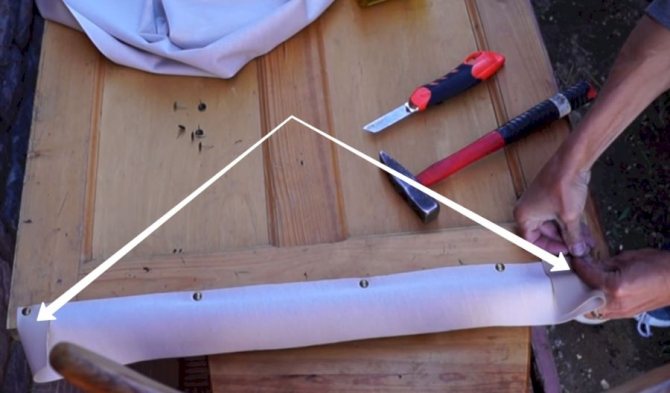 - Une bande ou un panneau, coupé à la taille de la porte, est appliqué sur la toile et fixé en plus avec des goujons ou des vis autotaraudeuses. En règle générale, la fixation n'est effectuée qu'aux endroits les plus nécessaires - c'est le milieu et les bords. Un nombre minimum de fixations peut être installé le long des bords - n'oubliez pas qu'en plus des clous et des vis autotaraudeuses, nous utilisons également une colle capable de maintenir le revêtement pas pire que les fixations mécaniques.