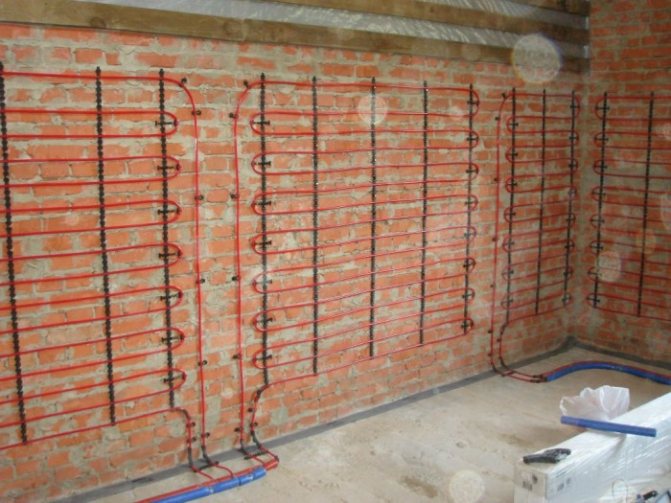 De cette manière, l'installation de tuyaux dans les murs extérieurs est effectuée. Les tuyaux sont posés en méandre, de préférence horizontalement, avec une distance de tuyau de 15, 20 ou 25 cm Cette solution permet le chauffage le plus efficace et l'utilisation des plus petits rayons de courbure des tuyaux.