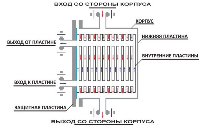 Chaque échangeur de chaleur doit avoir des informations sur le type de produit, le fabricant, la pression maximale et d'essai, la température de fonctionnement maximale, le schéma de l'emplacement de montage, la désignation des contours, qui peuvent être situés à la fois en diagonale et dans le plan vertical obligatoire. Une flèche spéciale indique le sens d'installation du produit, c'est-à-dire dans quelle position exacte il doit être installé. Il est important de comprendre comment le liquide de refroidissement s'écoule. La circulation elle-même est effectuée par la soi-disant pompe de circulation.