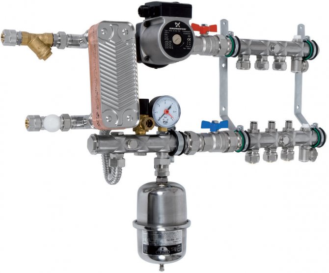 Ainsi, si le chauffage central de votre maison est éteint ou s'il est complètement absent, cela n'affectera en rien la température du sol. Mais il convient de noter que vous aurez besoin non seulement d'un échangeur de chaleur, mais également d'un vase d'expansion, d'une unité avec un puisard et d'un groupe de sécurité.