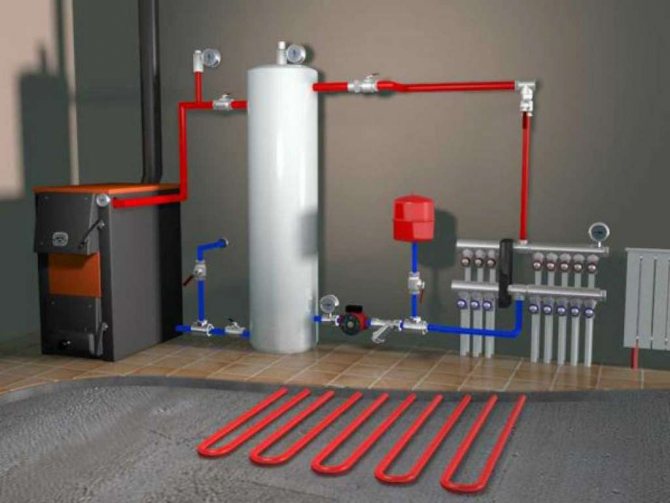 Une fois le distributeur de chauffage par le sol installé, une pompe avec une vanne à trois voies est assemblée dessus. Ensuite, la chaudière électrique est installée (pour une utilisation hors saison), y compris les accessoires nécessaires. Autrement dit, tout d'abord, l'alimentation de l'échangeur de chaleur de la chaudière est connectée, puis les tés sont coupés, le distributeur avec la vanne est connecté, des thermomètres sont placés et un vase d'expansion est installé à l'endroit le plus pratique, par exemple, vous pouvez le faire sous l'évier. Il est nécessaire de procéder à l'installation de manière à permettre un accès facile à tous les équipements.