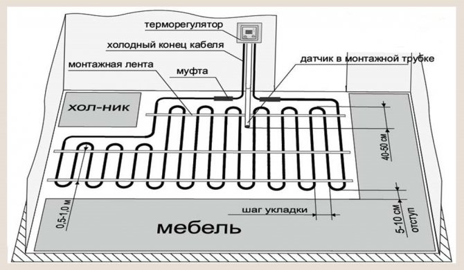 Pour le calcul, vous devez prendre en compte le dispositif de chauffage par le sol électrique. Le schéma de ce type de chauffage comprend:
