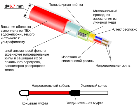 Des capteurs thermiques contrôlent la température de chauffage, les éléments chauffants effectuent le chauffage en conséquence. Ces pièces sont montées directement dans le sol et, à l'aide de câbles d'installation (d'alimentation), sont connectés au thermostat, qui définit le mode de fonctionnement.