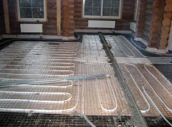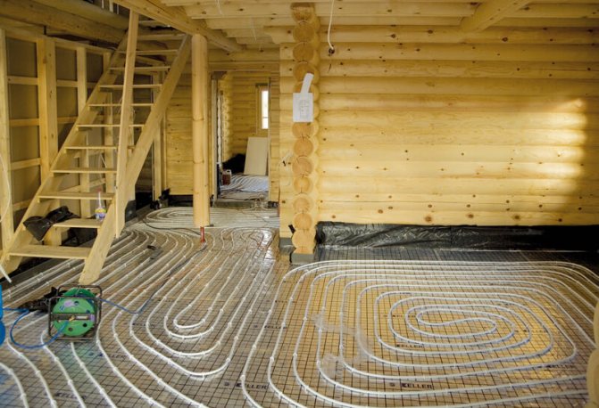 Étant donné que dans les maisons faites de poutres en bois, les planchers du premier étage ou du plafond au-dessus du sous-sol sont souvent en béton, la méthode traditionnelle d'installation des systèmes d'eau au sol ne peut pas être complètement balayée. De plus, vous ne devriez pas être intelligent sur de telles bases avec un sol chaud sur des bûches de bois, cela entraînera des coûts inutiles et le résultat risque de ne pas répondre à vos attentes. Il est préférable d'installer un système de chauffage sous la chape sur des sols en béton rugueux, puis de poser le revêtement de sol en bois.
