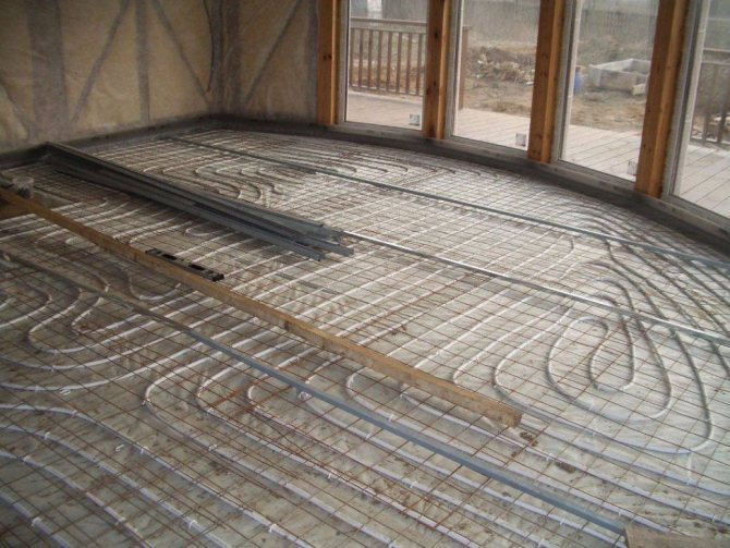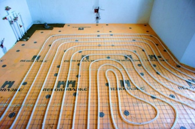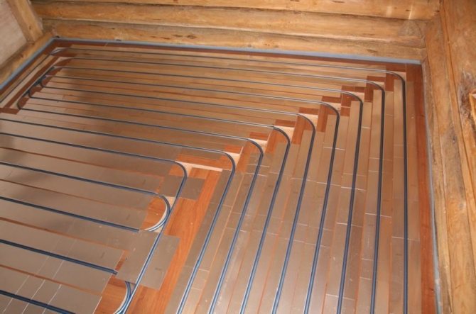 Le dispositif du sous-plancher directement pour les tuyaux, accompagné de la création de rainures pour leur pose. Les tuyaux posés dans les rainures sont isolés de la base avec une couche de papier d'aluminium, de bandes d'aluminium et fixés aux panneaux.