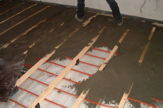 La dernière étape est le remplissage de la chape. L'épaisseur optimale de la couche de mortier est de 3 à 5 cm au-dessus du sommet du tuyau, le temps de solidification complète est de 3 semaines. Après cela, vous pouvez enfin créer un sol chaud dans une maison en bois en appliquant une couche de finition sur la chape.
