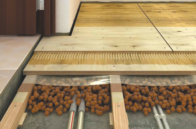 Dans les bâtiments en bois, les sols chauds avec un liquide de refroidissement peuvent être montés de 2 manières: