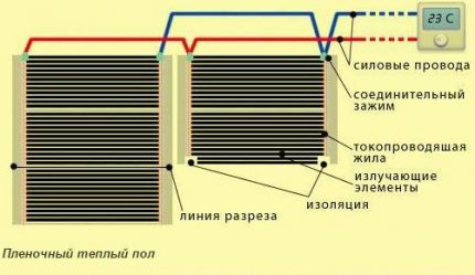 L'installation dans chaque pièce vous permet d'utiliser le système de plancher chauffant le plus efficacement possible. Des capteurs thermiques séparés sont collés aux bandes de film IR à l'aide de mastic. De plus, chaque appareil doit être solidement fixé à l'élément thermique en carbone.