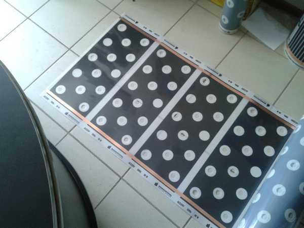 Le processus de laminage du film infrarouge est réalisé sur l'isolant à une distance de 50 cm de la paroi. Dans ce cas, le placement de la bande de cuivre doit être clairement en bas. Si nécessaire, coupez le matériau en bandes égales, en fonction du marquage des sections de film.