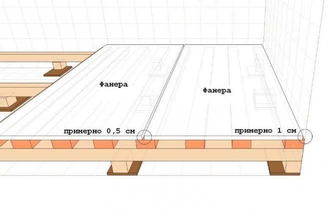 Ensuite, vous devez disposer les feuilles, ce qui vous permettra de couper le plus efficacement possible le matériau source. Le contreplaqué est pré-posé en tenant compte des joints pour l'expansion du matériau sous charge et des fluctuations de température (les joints d'amortissement mesurent 3-4 mm). 8 à 10 mm sont laissés entre le mur et le sous-plancher.