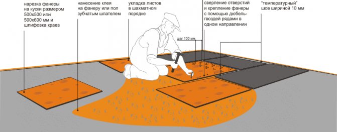 L'installation sur colle s'effectue dans l'ordre suivant. Après avoir terminé les travaux préparatoires, les sols sont vérifiés avec un niveau. Si la dénivellation verticale est inférieure à 1 cm, la méthode décrite ci-dessous peut être utilisée. Pour compenser les irrégularités de vos propres mains, un substrat en contreplaqué est utilisé, dont les joints sont collés avec du ruban adhésif.