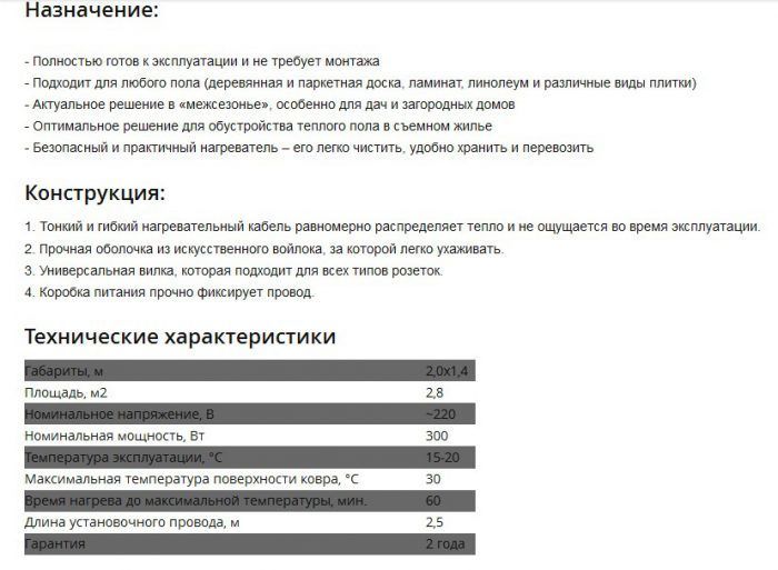 - Réchauffement rapide. Si vous réglez la température au-dessus de 30 ° C, le tapis perdra rapidement ses qualités positives.