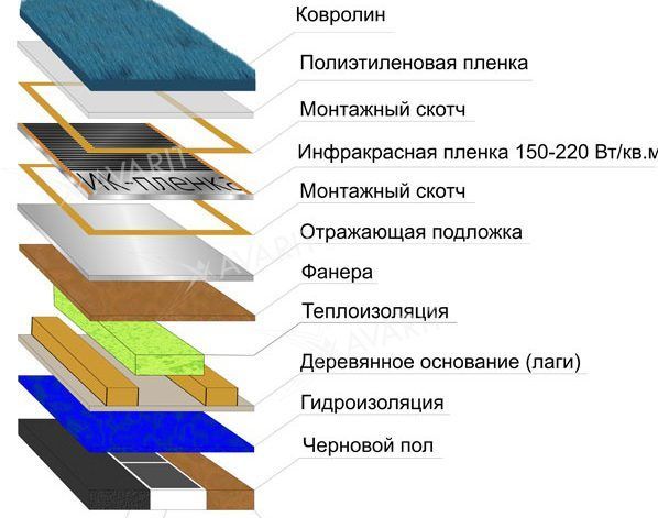 Une variante d'un système de chauffage moderne, dont les éléments chauffants n'ont pas besoin d'être coulés avec une chape, est un sol chaud infrarouge sous un tapis, un stratifié ou un linoléum. De plus, l'installation du revêtement de sol en film est très simple et sa faible hauteur n'interférera pas avec l'ouverture des portes lors de l'installation.