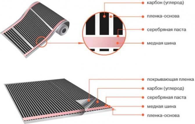 Ce revêtement est visuellement un film de carbone dans lequel sont montées de minces plaques de matériau diélectrique, qui sont des éléments chauffants du système de plancher chauffant infrarouge et sont interconnectées par de minces conducteurs plaqués argent.