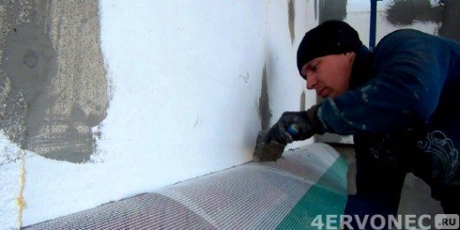 Ensuite, ils procèdent à l'installation du treillis d'armature sur la façade. Il s'agit d'un treillis spécial en fibre de verre qui est fixé à l'isolant soit avec des attaches en plastique, soit sur du plâtre. Lors de la fixation du treillis au plâtre, il est important de s'assurer que la couche de composition sur le mur est d'au moins 2 millimètres.