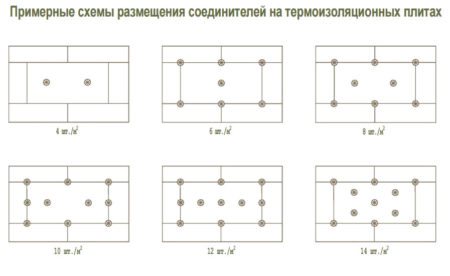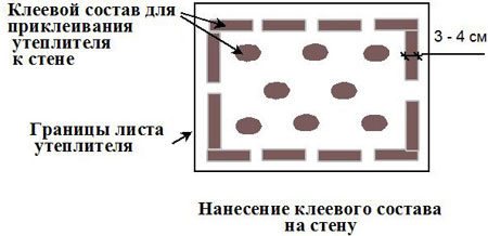 Appuyez maintenant la dalle contre le mur. Retirer l'excès de mortier avec une truelle. Il est préférable de fixer les plaques avec une élingue, alors il n'y a pas d'espace pour le flux de froid vers les murs. Sur l'emballage, lisez l'heure de séchage complet de la composition, généralement au moins une journée. Laissez sécher la colle. Si vous commencez à fixer avec des «champignons» à l'avance, l'isolant peut se trouver derrière le mur sur les bords. Lors de la fixation, utilisez du plastique, car ils ne fournissent pas de pont froid. Corrigez selon le schéma montré sur la photo.