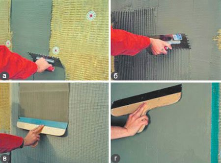 Leur surface est recouverte d'une couche de colle, dans laquelle un treillis en fibre de verre et un profilé d'angle en métal sont noyés dessus. Ensuite, la colle est uniformément répartie sur la surface de l'isolant. L'épaisseur optimale de la couche est de 3 mm. Pour le travail, un flotteur de construction et une spatule large conviennent.
