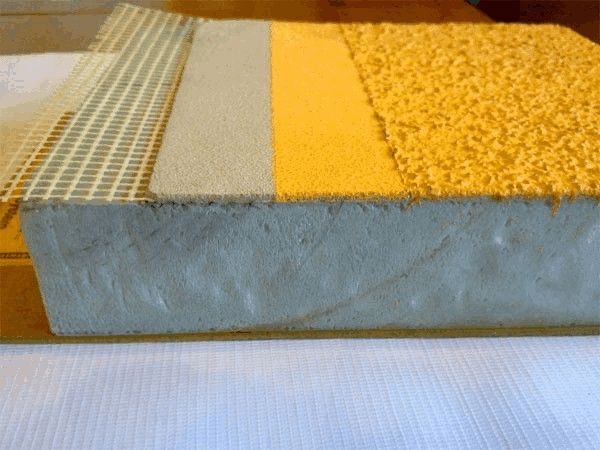 - Ensuite, les dalles sont renforcées avec un treillis en fibre de verre. Il est collé aux panneaux isolants avec une colle spéciale appliquée des deux côtés du treillis.