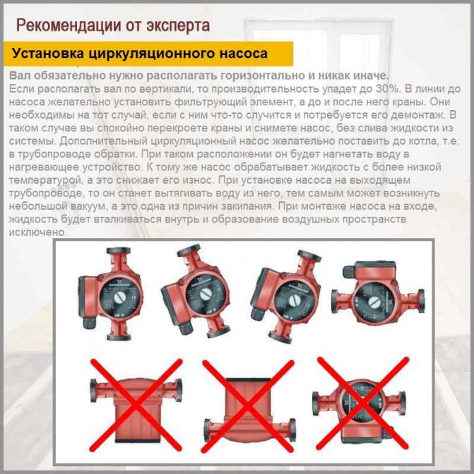 Dans un système conventionnel, les installateurs utilisent toujours la deuxième option - il est optimal de placer la pompe juste devant la chaudière, d'où elle donnera un débit d'eau, ce qui assurera son chauffage uniforme. Mais dans le cas du chauffage par le sol, il est préférable de choisir l'installation sur l'alimentation. Ceci est fait afin d'éviter autant que possible l'air d'entrer dans le système.