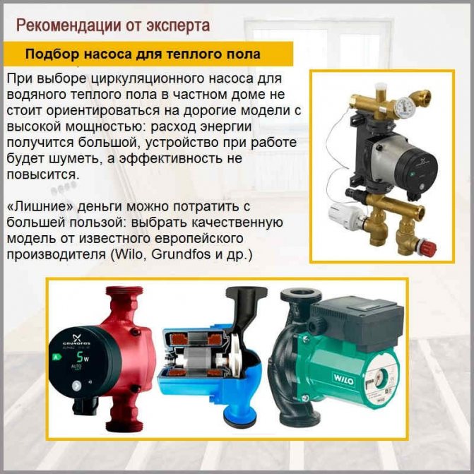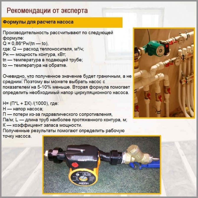 Pour le chauffage par le sol, des pompes de circulation sont utilisées; du point de vue de leurs paramètres techniques, elles répondent au maximum aux exigences avancées. La capacité de la pompe est calculée par la formule