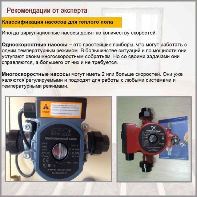 - Un autre argument en faveur du choix d'un appareil avec plusieurs modes de vitesse. Le plus grand effet d'un plancher chaud se produit lors du contrôle de la température du liquide de refroidissement dans chaque pièce prise séparément.Par conséquent, lors de l'installation d'une unité de circulation, cette nuance doit être prise en compte.