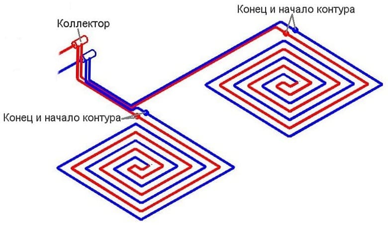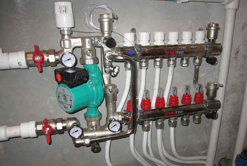 Le liquide de refroidissement chauffé à une température de 35 à 45 degrés, passant par le pipeline, perd sa température. La longueur optimale de la canalisation (boucle) peut atteindre 120 m, ce qui est suffisant pour couvrir une pièce d'une superficie allant jusqu'à 20 m2. Pour les grandes pièces, plusieurs canalisations sont installées. Ils sont connectés à la source de chaleur en parallèle via un collecteur situé dans une armoire spéciale. Il installe également des équipements d'arrêt et de contrôle et de régulation (manomètres, thermostats, robinets de vidange, capteurs de débit, vannes d'air), ainsi que des pompes.
